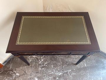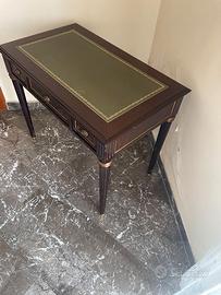 Bellissimo scrittoio in stile classico, ideale per camera da pranzo, studio, ufficio o angolo lettura. Realizzato in legno di ottima qualità, si distingue per il piano rivestito in pelle verde con cornice decorativa dorata, che dona un tocco di grande eleganza e raffinatezza.