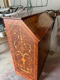 Vendo un elegante mobile scrittoio a ribalta, finemente decorato con motivi floreali intarsiati in stile classico. Si tratta di un pezzo d’arredo raffinato, ideale per chi ama lo stile tradizionale o vuole aggiungere un tocco di classe a uno studio, un salotto o una camera da letto. Il mobile è composto da una parte superiore con ribalta che, una volta aperta, diventa un comodo piano di scrittura o appoggio. All’interno si trovano due piccoli cassetti e alcuni vani, perfetti per riporre documenti, cancelleria o piccoli oggetti. La decorazione interna è curata quanto quella esterna, con intarsi chiari che creano eleganti volute e fiori. Nella parte inferiore ci sono due ante che nascondono due ampi ripiani interni, utili per libri, cartelle o altri oggetti domestici. Tutto il mobile è rifinito con impiallacciatura in legno scuro e intarsi a contrasto. Non si tratta di legno massello pieno, ma di una struttura solida in pannelli rivestiti, come spesso avviene nei mobili decorativi di questo tipo. Le condizioni generali sono buone: la struttura è stabile, le cerniere della ribalta funzionano perfettamente e le decorazioni sono ben conservate. Presenta solo lievi segni del tempo, del tutto compatibili con l’età e l’uso. Resto a disposizione per informazioni