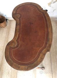 SCRITTOIO/TAVOLINO di epoca vittoriana in radica di noce nella classica forma “a fagiolo” o “a rene” (kidney-shaped). Rivestimento in pelle rossa bordata a inserti (parzialmente consumati) in oro.
