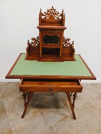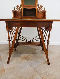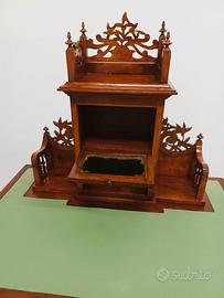 Scrittoio stile liberty, in legno traforato con scompartimento in vetro cattedrale è un mobile dal design unico e caratteristico. Realizzato interamente in legno traforato, presenta una lavorazione dettagliata e raffinata che conferisce un tocco di eleganza e originalità, il suo scompartimento in vetro cattedrale è particolarmente peculiare, offrendo una vista trasparente all'interno e creando un interessante contrasto con la struttura in legno, lo scrittoio è un pezzo d'arredamento versatile e di alta qualità, perfetto per arricchire ambienti antichi e contemporanei, con stile e funzionalità.