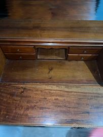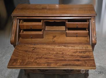 Elegante scrittoio in legno massello con ribalta e tre ampi cassetti. Stile classico con maniglie originali e decori intagliati.