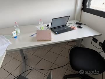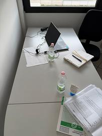 Vendesi due scrivanie 140x80, in legno color grigio chiaro, una delle quali con foro per passaggio cavi di collegamento PC/Monitor. É possibile venderle separatamente oppure combinate con elemento di congiunzione in modo da avere un’unica scrivania 220x220.