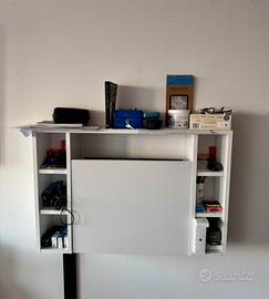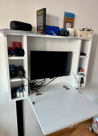 Vendo scrivania a parete bianca, ideale per chi ha poco spazio o vuole una soluzione ordinata e moderna. Design salvaspazio: si apre e si richiude facilmente •Piano di lavoro a ribalta stabile e resistente •Vani laterali con ripiani per organizzare oggetti, cancelleria o accessori •Spazio interno per monitor o laptop •Colore bianco, si adatta a qualsiasi ambiente (casa o ufficio)