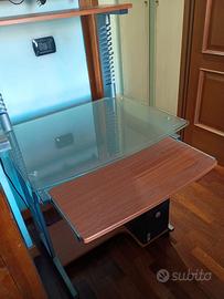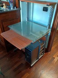 Scrivania a più ripiani con piano alto in legno, piano medio in vetro, piano medio estendibile in legno, piano inferiore in legno, con sagomatura adatta ad ospitare hard-disk esterno per PC.