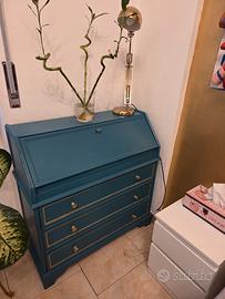 vendo scrivania a ribalta anni 70 completamente restaurata e modernizzata, color ottanio con rifiniture in oro. i pomelli sono dorati e satinati. e i 3 cassettini all'interno della scrivania sono originali anche nei pomelli. pezzo unico al prezzo di 400 euro. ritirabile in loco.
