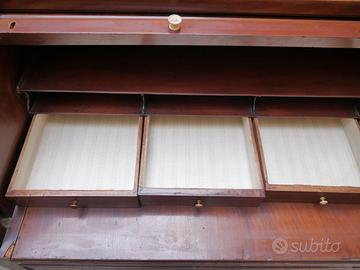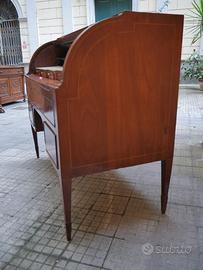 Scrivania a rullo impiallacciata in mogano con filettature in bosso, XIX secolo, rullo celante all'interno tre cassettini e vani