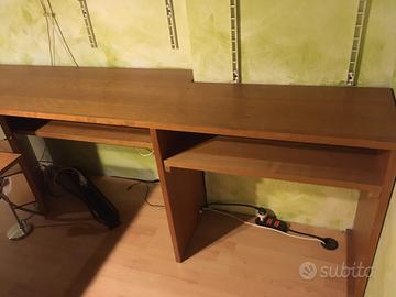 Scrivania composta da piano di appoggio angolare di dimensioni 1,30 m per 2,00 m; due mensole sotto piano per appoggio stampanti e altro; piano per appoggio tastiera e mouse ampio ed estraibile in legno. Per la lunghezza della scrivania fino agli scalini è presente una bellissima ringhiera protettiva in legno decorativa.