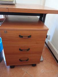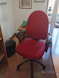 Scrivanie in legno 3 postazioni divisibile completa di 1 cassettiera a 3 cassetti laterale + 2 sedie rosse con ruote e 1 sedia rossa Misure totali lunghezza 2,42 larghezza 2,92 .Smontaggio ritiro(Roma zona Prati) e trasporto a carico dell acquirente
