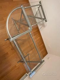 Scrivania ad L in vetro temperato e acciaio, dotata di ripiano scorrevole per tastiera pc e 2 poggia piedi