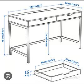 Vendo scrivania IKEA di cm 132 larghezza ×60 profondità × 76,5 altezza. Vedi ultima foto per dimensioni esatte.