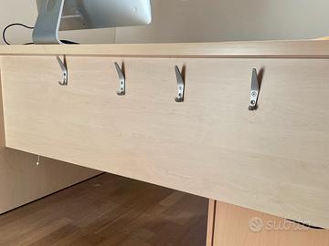 La scrivania principale possiede due fori passacavi e sul retro delle placchette in metallo per appendere oggetti/zaini, visibili in foto