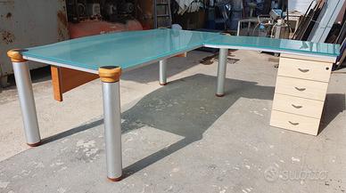 SCRIVANIA ANGOLARE CON PIANO IN CRISTALLO TEMPERATO E SATINATO CON CASSETTIERA Usata, buone condizioni Dimensioni: cm 200x217x75h PREZZO FATTURABILE