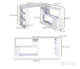 Scrivania bianca angolare reversibile con 5 ripiani.