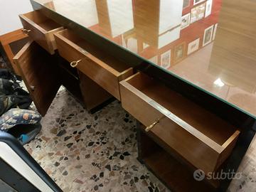 Scrivania a 3 cassetti 1 anta e 2 vani a giorno.
