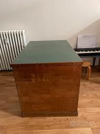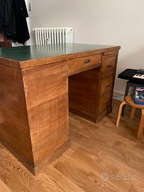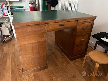 Scrivania anni ‘50 per bambini, utilizzabile da entrambi i lati con cassetti. Mogano e piano verde.