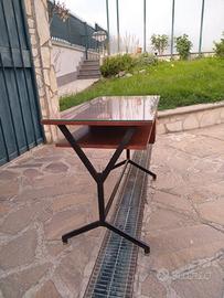 Scrivania anni ’50 in stile scandinavo con piano e 3 cassetti in legno, struttura metallica e piedini in ottone. Sul piano è presente un rivestimento in vetro. Zona Vermicino (Tuscolana).