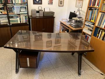 Grande scrivania direzionale modello Tolomeo, disegnata da Ico Parisi nel 1958 per MIM (Mobili Italiani Moderni). La scrivania è composta da un ampio piano leggermente curvo in teak con cassettiera bifacciale a tre cassetti sul lato seduta e due cassetti sul lato frontale. La scrivania si presenta in ottime condizioni generali con piccoli segni del tempo visibili in foto. Disponibile anche la libreria e il mobile basso ad ante scorrevoli della stessa linea, che completano lo studio.