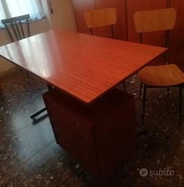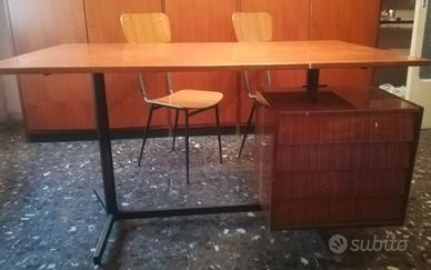 Scrivania con cassettiera e due sedie, anni '70; in legno con struttura in ferro. Ottime condizioni, molto bella. Misure cm 73 x 140.