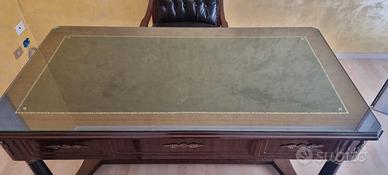 Scrivania antica in legno con 3 sedie. Tavolo con con panno in pelle coperto da vetro e tre cassetti. Decori in ottone sia del tavolo e sia delle sedie (come evidenziato dalle foto) di cui una presidenziale. Usato poco ma ben conservato.