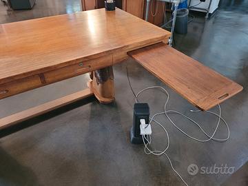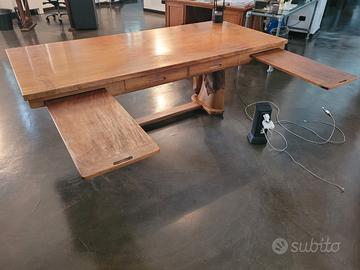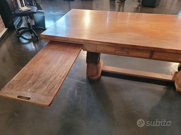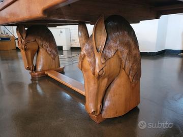 Grande scrivania antica in legno di afrormosia, realizzata da un unico albero. Misure: 213x94x75 cm circa. La base è costituita da due teste di cavallo intagliate nel legno. La scrivania ha due profondi cassetti e due ripiani estraibili. L’arredo è appartenuto a Federico Zeri.