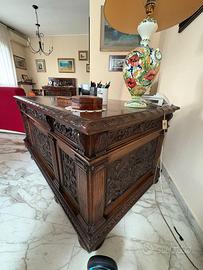 Vendo causa trasloco, elegante scrivania d'epoca risalente ai primi del '900, realizzata in legno massello con raffinati intagli ornamentali a motivi floreali e fogliati. Si tratta di un pezzo imponente, ricco di dettagli artigianali, con maniglie e serrature originali in ottone lavorato. La scrivania è composta da cassetti e sportelli con chiavi funzionanti, perfettamente conservata e pronta per l'uso o l'esposizione. Ideale per uno studio classico, un ufficio di rappresentanza o per collezionisti di mobili antichi. Caratteristiche principali: Epoca: Inizio Novecento Materiale: Legno massello (probabilmente noce) Lavorazione: Intagliata a mano Condizioni: Ottime, solo lievi segni del tempo Misure: 1.70*90*h80