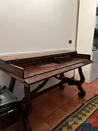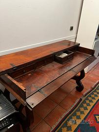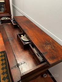 Tipologia "A Bureaux" o a Scomparsa: La particolarità assoluta è il sistema di apertura. Il piano superiore è diviso e incernierato: ribaltandolo, rivela un vano interno attrezzato con piccoli cassetti (stipo). Questo design serviva a proteggere documenti riservati e a nascondere il disordine della scrittura quando non in uso. Il basamento è eccezionale. Le gambe sagomate a forma di voluta (o lira), collegate da una traversa robusta, sono tipiche dello stile Barocchetto o Luigi XIV, ma interpretate con una solidità che suggerisce una manifattura dell'Italia centrale o settentrionale del XIX secolo (XIX secolo). Le cerniere a vista in ferro battuto, lunghe e lavorate, non sono solo funzionali ma un elemento decorativo fondamentale. Donano al mobile un aspetto austero e autentico. Quando è chiusa, la scrivania si presenta come una fratina o una console lineare ed elegante (come si vede nella foto con il runner rosso), rendendola perfetta anche per ingressi o corridoi, non solo per studi.