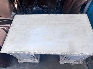 Vendo magnifica scrivania d'epoca , in stile decapè (shabby chic). La scrivania presenta un'ampio superficie di lavoro e una struttura robusta , ha tre cassetti superiori e due sportelli laterali, di cui uno nasconde un vano con ripiano e altro tre cassetti aggiuntivi. Misure: L 140 x P 80 x H 80 cm