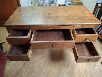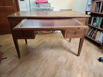 Vendo elegante scrivania antica in legno massello, risalente indicativamente al XIX secolo. Mobile autentico, solido e di ottima fattura, con una bella patina naturale acquisita nel tempo. La scrivania è composta da 5 cassetti (4 laterali + 1 centrale) ed è dotata di un pratico piano scrittoio estraibile, rivestito in pelle di colore rosso, ideale per la scrittura. Dimensioni: -Larghezza: 125 cm -Profondità: 65 cm -Altezza: 80 cm Caratteristiche: -Struttura in legno massello (probabile noce) -Piano con segni del tempo che ne testimoniano l’autenticità -Cassetti con serrature originali -Linea semplice ed elegante, adatta sia ad ambienti classici che moderni Condizioni: Buone condizioni generali. Il piano superiore presenta segni e macchie dovuti all’uso e al passare del tempo (visibili in foto), che non compromettono la funzionalità del mobile. Mobile pronto all’uso, ideale come scrivania, scrittoio o elemento d’arredo di carattere. Ritiro a carico dell’acquirente. Per ulteriori informazioni o foto, contattami senza problemi