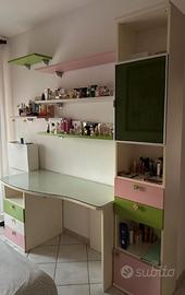Scrivania lunga 1.60 con vetro per proteggere mensole di varie misure.
