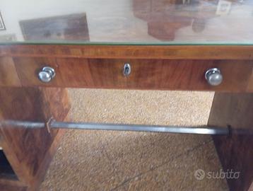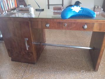 Scrittoio da centro Art Déco in noce con pomelli nichelati, anni '40, vetro a protezione del piano, si suggerisce restauro con lucidatura per fare esaltare la bellezza della scrivania. Piccola distacco di 4 cm della laccatura sulla parte sx