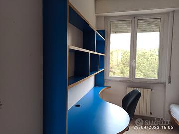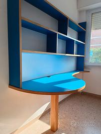 Scrivania a parete con scaffali di fattura artigianale, in legno multistrato sp.3 cm. Piano di lavoro curvo (come in foto) poggiato su un montante e tre livelli di scaffali fissati a muro da squadrette con pannello retro bianco. La scrivania ha due buchi passacavi per pc e schermi.