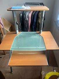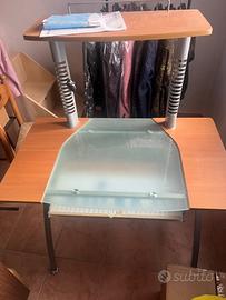 Vendo scrivania da casa o piccolo ufficio composta in truciolato , alluminio e vetro 120di lunghezza per 160 cm di altezza se si considera la parte superiore che è smontabile . La scrivania ha dei difetti dovuti al tempo ( legno finto adesivo scollato nella parte scorrevole ) . Vendo per fare spazio .