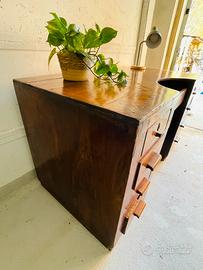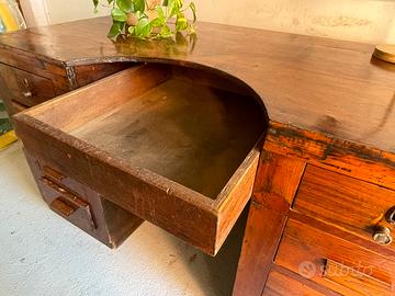 particolare Bancone da Orafo vintage, probabilmente in noce, con cassetti laterali e cassetto centrale. Condizioni molto buone nonostante l’età, necessita solo di qualche piccolo intervento migliorativo (vedi foto). Misure 139x70 cm, altezza 80 cm.