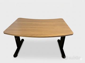 Scrivania ergonomica curva. Vendo scrivania spaziosa con piano sagomato effetto legno e gambe a T in metallo nero, molto stabile. La forma curva è comodissima per chi lavora molto al PC perché permette di appoggiare bene le braccia.