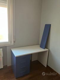 Vendo una scrivania bianca con cassetti blu, in buone condizioni 60x120 cm, di altezza 75 cm + mensola blu 90x25 cm.