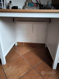 scrivania IKEA serie Hemnes con piano in legno massiccio e struttura bianca. È super funzionale: da un lato ha due comodi cassetti e dall'altro uno scomparto con anta, perfetto per tenere la postazione di lavoro ordinata. Sotto il piano ha anche un vano a scomparsa per nascondere i cavi e le multiprese.