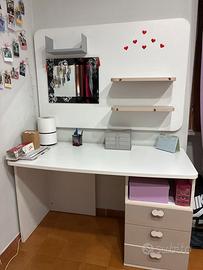 Scrivania bianca con cassetti e mensole