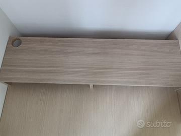 Scrivania in legno realizzata su misura, compresa di rialzo mobile adatto a riporre tastiera desktop con tastierino numerico o laptop di piccole dimensioni.