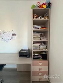 PREZZO TRATTABILE Scrivania lunga,con scaffale verticale,color legno chiaro,con dettagli rosa neutro.Presenta dele piccole imperfezioni sul tavolo da lavoro,ma ricopribili con smalto per mobili