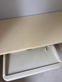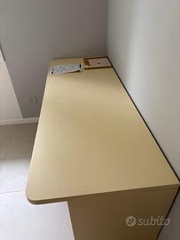 Mobile scrivania comprata da Matteuzzi a Bologna a suo tempo ben tenuta color panna, misure 160x60 altezza 81, con mobiletto su 4 ruote a due vani aperti da posizionare sotto la scrivania o di fianco misure 33x44 altezza 75.