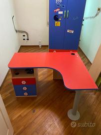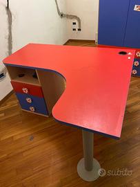 Scrivania ad angolo sagomata rosso blu Lunghezza parte cassetti 140 profondità 60 Lunghezza parte dx 120 Altezza 78 Con 3 cassetti ed un vano aperto