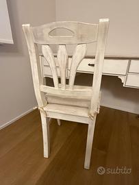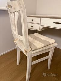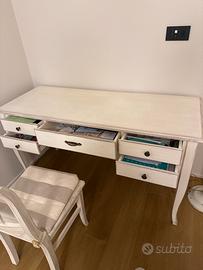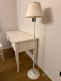 Vendo scrivania in legno massello stile provenzale decapata bianca in buonissime condizioni completa di sedia in legno massello stessa lavorazione .e’ dotata di 5 cassetti 4 piccoli larghi 33cm lunghi 47 ,ed uno largo 57 lungo 57 .compreso nel prezzo lampada da terra con cappelliera in tessuto color avorio funzionante con accensione a pedale a terra ..dimensioni scrivania 60x150 la scrivania presenta piccole imperfezioni dovute all’uso anche se limitate