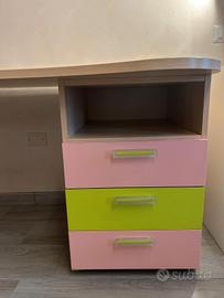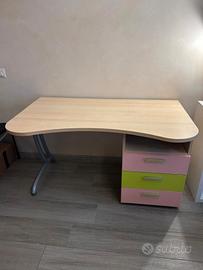 *Scrivania* in buono stato di legno laminato con 3 cassetti e un ripiano, ottima per chi vuole spazio nel piano di lavoro. Dimensione: Altezza: 0,74 cm Profondità: 0.75 / 0.65 cm Lunghezza: 1.30 cm Cubotto: 47.5x16.5 cm