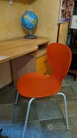 Vendo scrivania per cameretta colore arancione con piano scrittoio più tre cassetti e sedia abbinata. Per correttezza invio foto del segno che uno dei cassetti ha subito tempo fa.