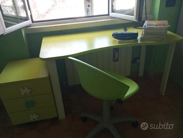 scrivania, cassettiera, sedia con rotelle