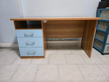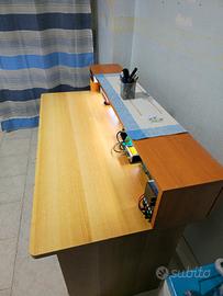 Scrivania color legno noce. condizioni discrete con piccoli segni di usura. Vendo abbinata a un rialzo, costruito separatamente, con possibilità di usarla come scrivania da laboratorio (come visibile in foto). Vendo senza prese e senza alcun tipo di accessori.Se non si vuole usare il rialzo rimangono evidenti dei piccoli buchi fatt per fissare il rialzo stesso. GIÀ SMONTATA.