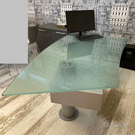 Grande scrivania di Cattelan Italia con piano in vetro di forma curva, struttura di sostegno di colore grigio metallizzato con 2 cassetti. Dimensioni di ingombro 200/150 x 86 cm H 72 cm Solo ritiro sul posto, non spedisco
