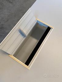 Il piano di lavoro realizzato in bianco è prodotto in nobilitato melaminico spessore 18 mm., bordato con bordo ABS in tinta rispetto al piano di lavoro.
