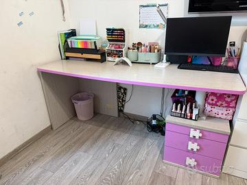 Vendo scrivania Colombini Golf con cassettiera. La scrivania, in colore rovere Portofino e rifiniture/cassettiera lato dx ciclamino ha misure (LxPxH) 180 x 65 x 78 cm ed ospita comodamente due postazioni studio.