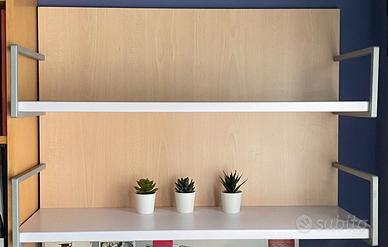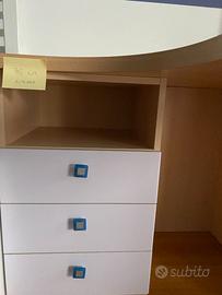 Scrivania completa di cassettiera misure: lunghezza 135 cm. profondità max 90 cm. cassettiera prof. 45 cm., altezza tot. 76 cm. - comodino quadrato dotato di ruote 45x45 h. 40 cm. - mensola/libreria larghezza 90 cm. altezza 64 cm. profondità 34 cm. - profondità ripiano 29,5 cm. - colore lilla molto chiaro con pomelli blu, cassetti molto capienti.